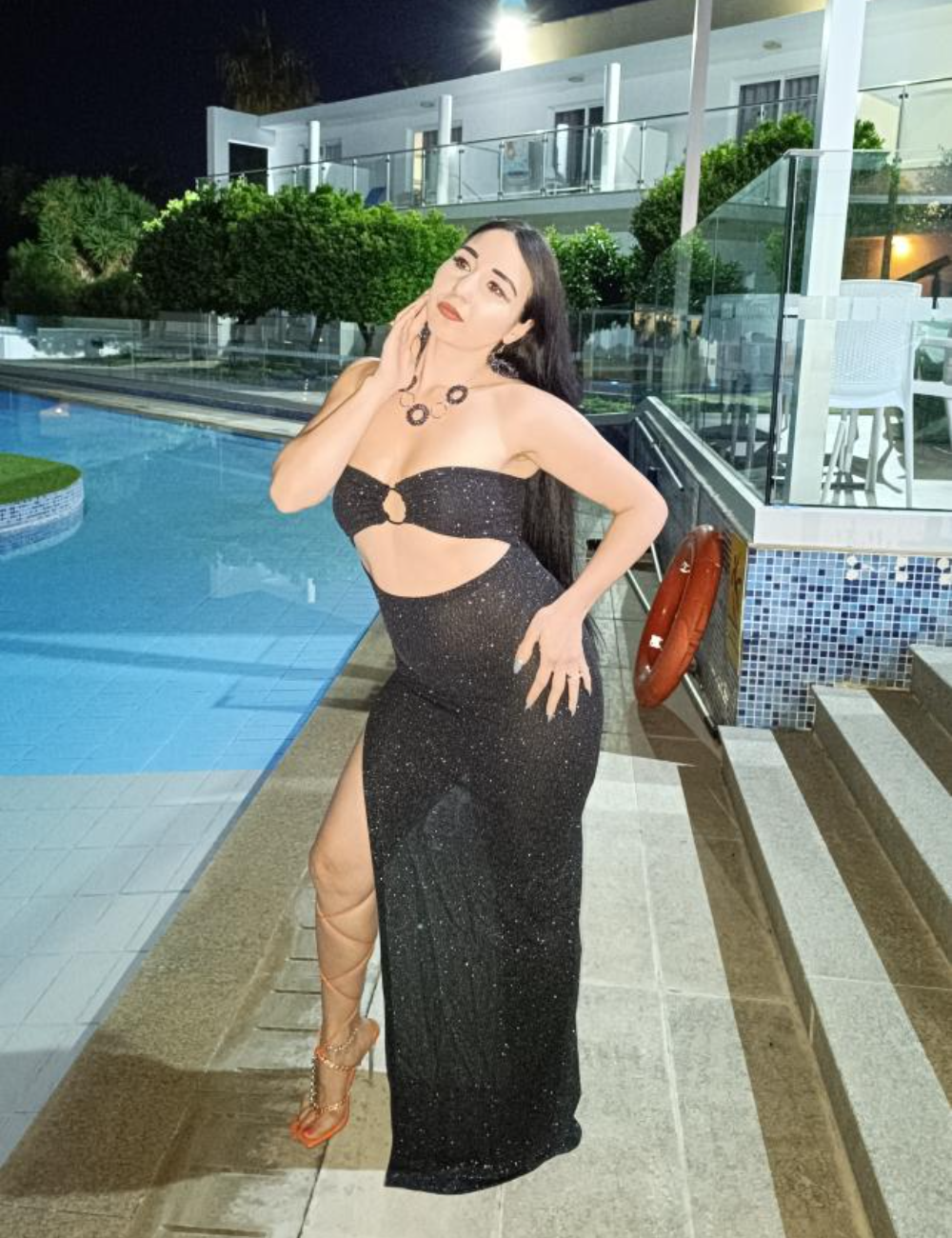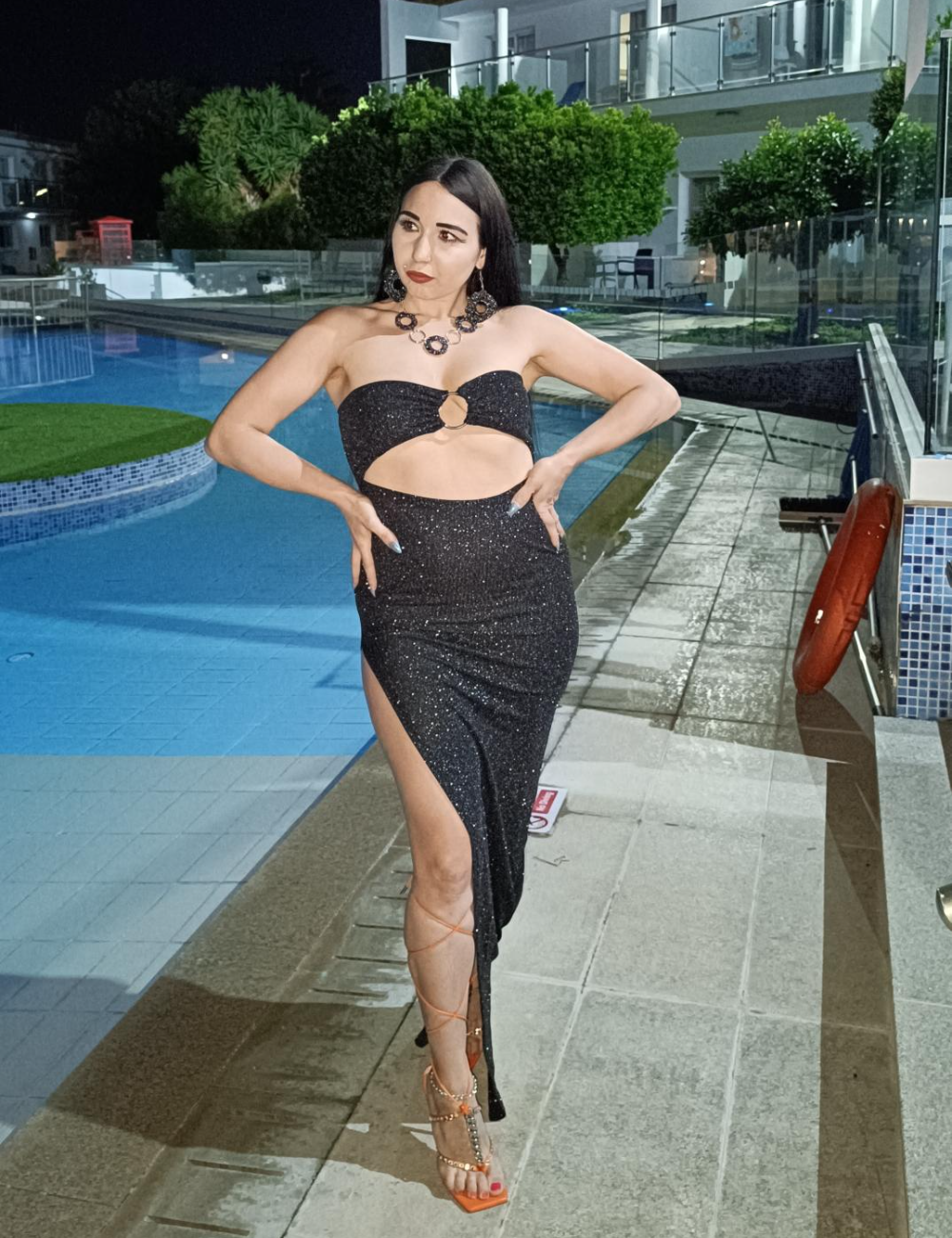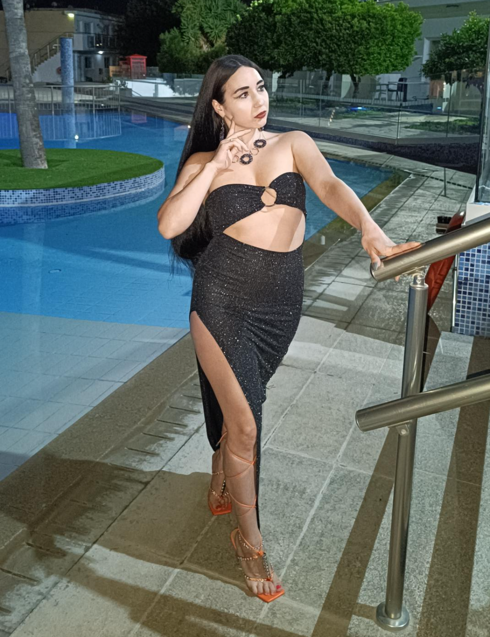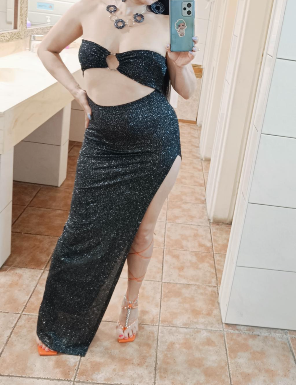 Shine with confidence in this glamorous glitter evening dress that perfectly combines elegance and allure. Featuring a bold front cut-out with delicate ring detailing and a high side slit, this dress highlights your figure while adding a modern, sophisticated edge. Ideal for evening parties, special events, or any night you want to make a dazzling impression.